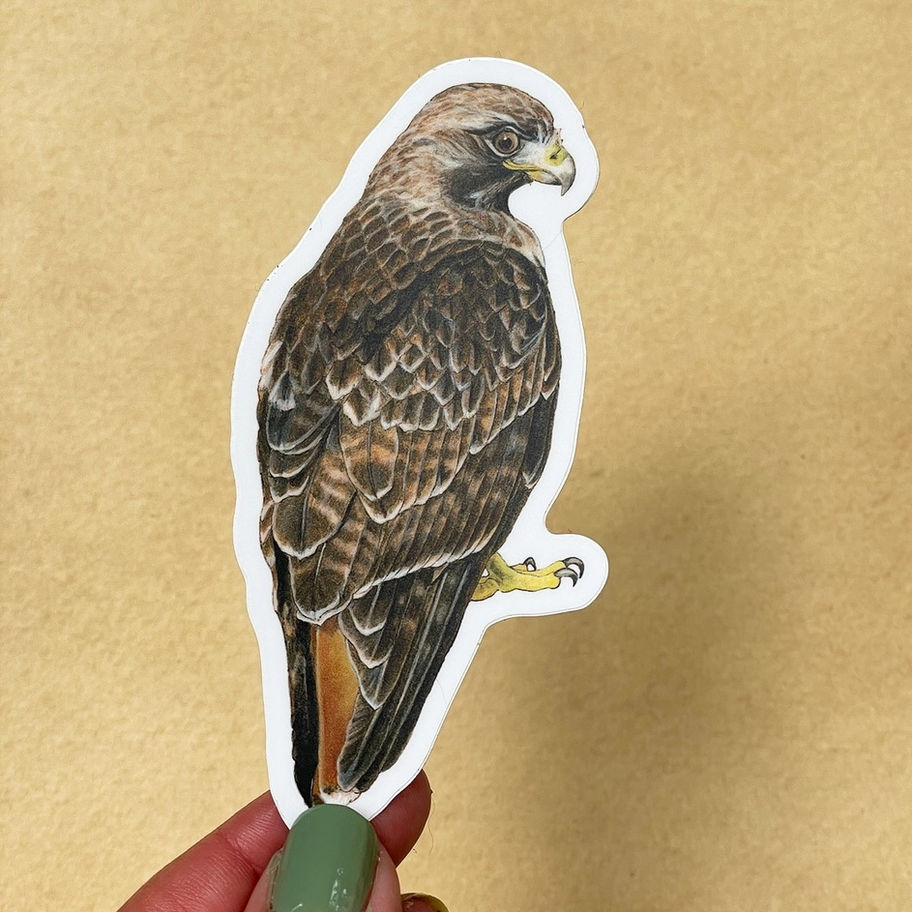 This gorgeous red-tailed hawk is serving some twinkly side-eye. From an original watercolor and ink painting. Each die-cut, vinyl sticker is super durable and is sun, water and even dishwasher resistant! Actual size: 2 x 4 inches.